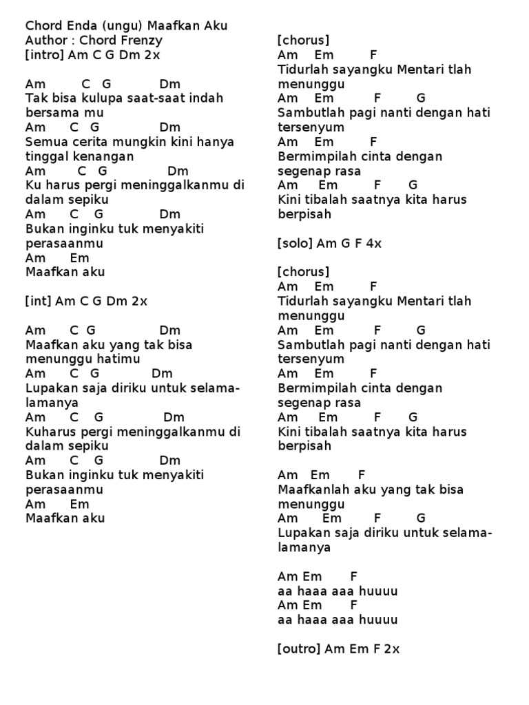 Kunci Gitar Enda Ungu Maafkan Aku / Am menduakan cintamu f berat rasa hatiku g tinggalkan dirinya c dan demi waktu am yang bergulir disampingmu f.