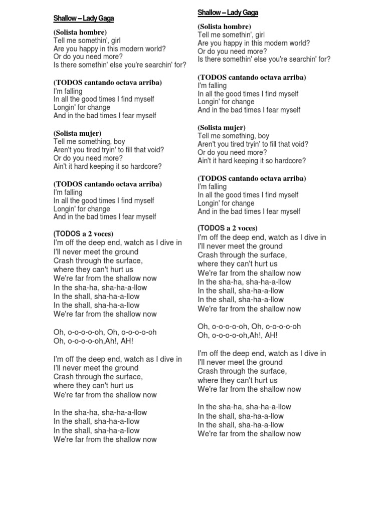 Letra De Shallow - In the shallow, shallow in the shallow, shallow in the shallow, shallow we're far from the shallow now.